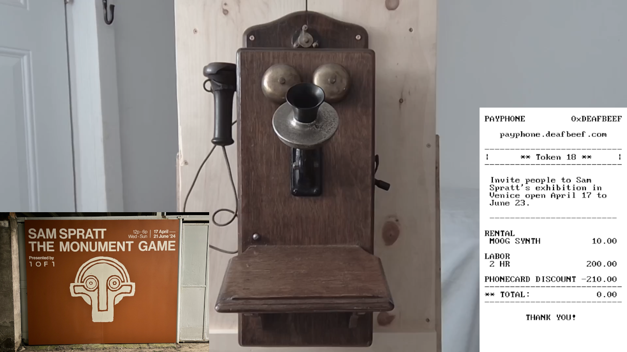 | 0xc9eeb.. | 1000034 | Invite people to Sam Spratt's exhibition in Venice open April 17 to June 23. |